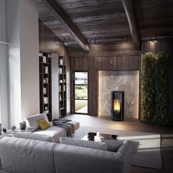 Le nouveau poêle à granulé MATISSE naît d’une recherche profonde sur l’essentialité des formes, unie à l’excellence des techniques artisanales 100% Made in Italy. Le cercle, élément primitif et infini, s’unit à la ligne verticale qui confère au produit une grande légèreté, originalité et dynamisme. L’élégant revêtement en verre trempé noir est entrecoupé par la trame vestimentaire de deux grilles verticales qui courent sur toute la longueur du poêle. MATISSE est le résultat de la synthèse de l’élégance intemporelle et de l’innovation extrême. Il dispose en effet de la technologie VERTICAL AIR®, d’un système d’alimentation à 24 Volts et du brûleur breveté J-EVO 3®. Derrière la trame de ses grilles se trouve le système VERTICAL AIR®, un brevet JM qui diffuse l’air verticalement et garantit une meilleure distribution de la chaleur dans l’environnement, de manière plus uniforme et enveloppante. En mode SILENT+, MATISSE chauffe naturellement sans l’aide de ventilateurs. Le poêle à granulé MATISSE est alimenté full 24 Volt, une technologie qui garantit des économies en termes de consommation électrique, un meilleur contrôle de la combustion et une plus grande fiabilité et sécurité. Grâce à un kit de batterie en option, le fonctionnement est garanti pendant plusieurs jours, même en l’absence de courant électrique. Associée au kit photovoltaïque/solaire JM, MATISSE atteint son autonomie maximale même en l’absence d’énergie électrique. La chambre de combustion en Fireflector de forme arrondie révèle le brûleur exclusif J-EVO 3®. Le nouveau brevet qui assure une combustion meilleure et plus précise des granulés grâce à la paire de motoréducteurs indépendants. En plus de la majeure silenciosité, J-EVO 3® garantit la possibilité d’éviter le nettoyage du brasier: la cendre excédentaire dérivée de la combustion est poussée directement dans le tiroir prévu à cet effet. Pour s’adapter aux différentes solutions de logement, il est possible d’utiliser la sortie fumée la plus appropriée : arrière, supérieure simple ou supérieure coaxiale. MATISSE est la synthèse d’une pensée conceptuelle recherchée, la qualité des matériaux et une attention artisanale et productive inégalée.